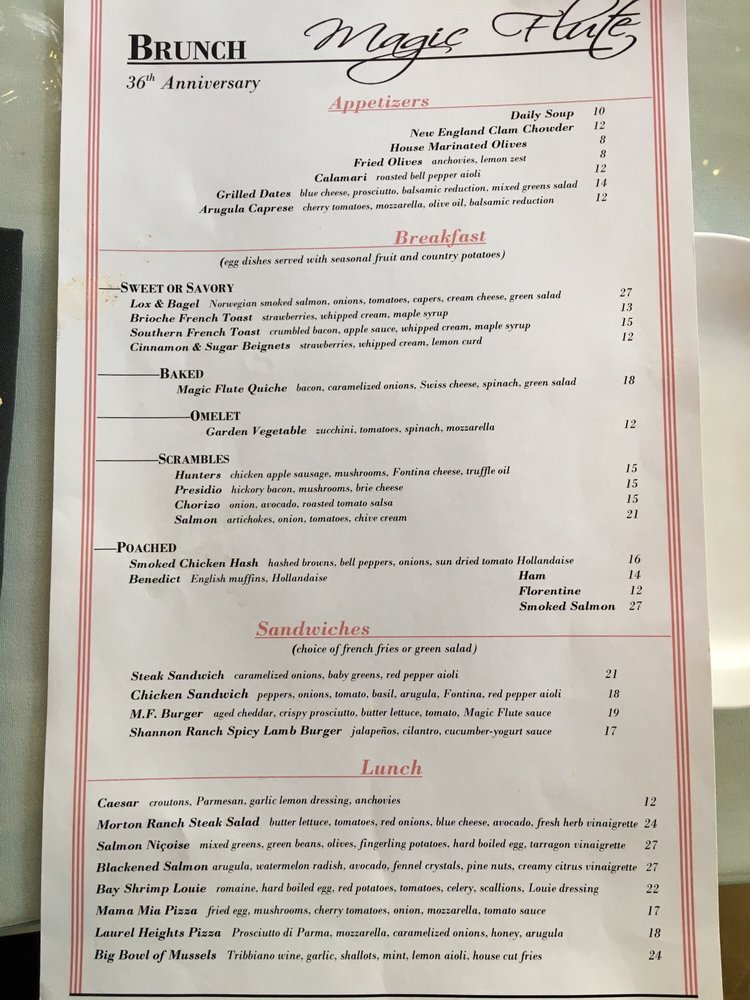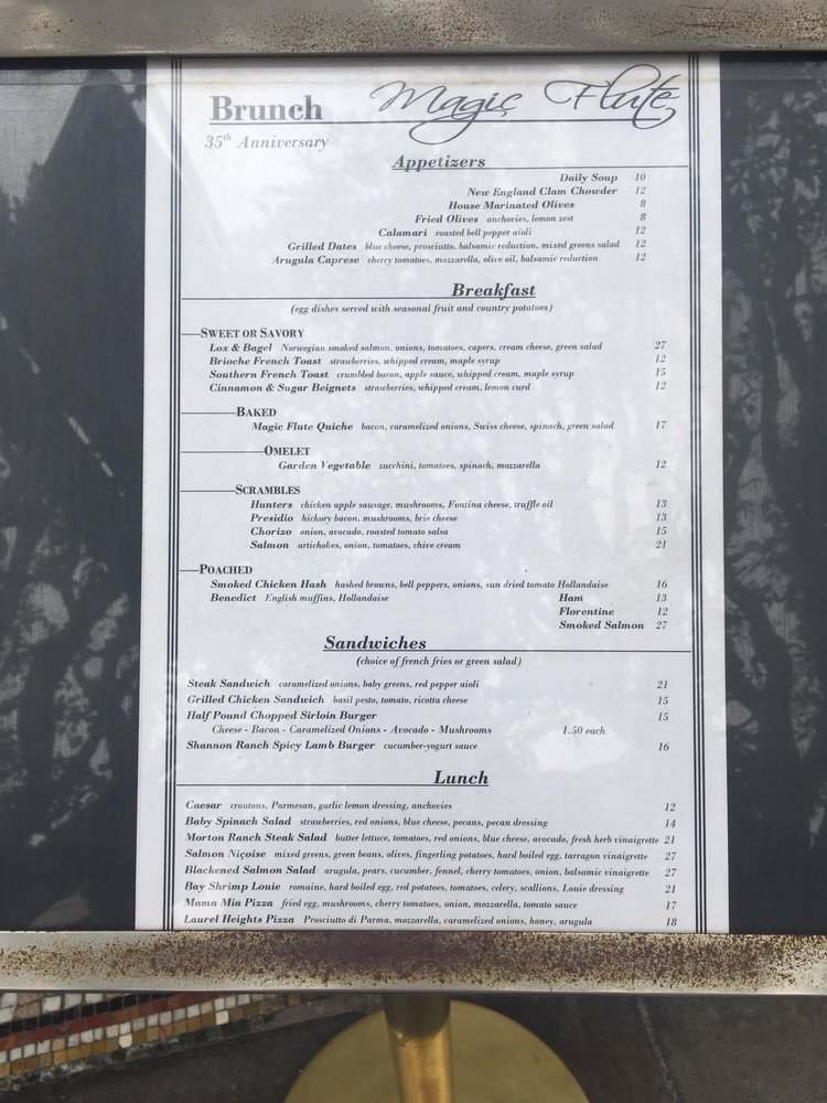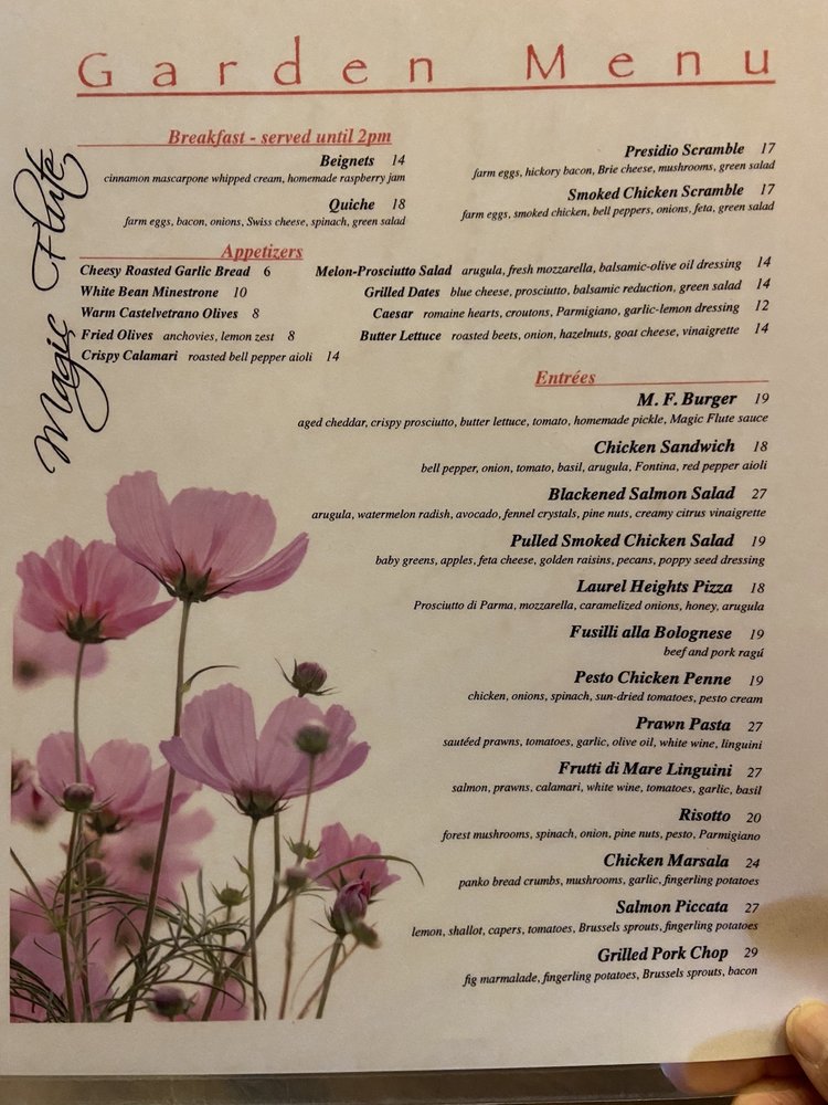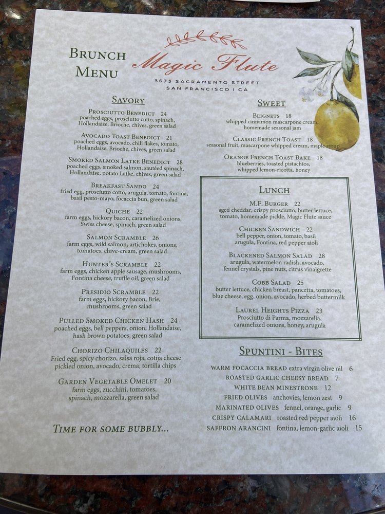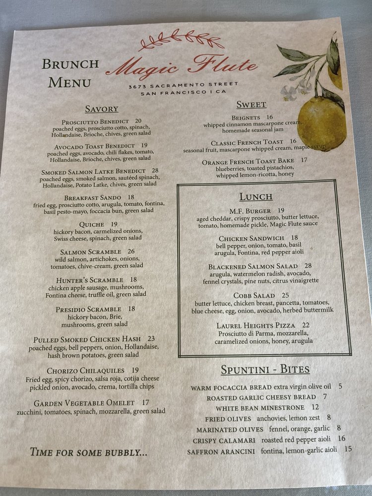 "Magic Flute Ristorante" offers a diverse menu with vegan and limited vegetarian options, catering to a range of dietary preferences. Located in San Francisco, this restaurant is wheelchair accessible and provides a cozy, intimate dining experience. Customers praise the attentive staff and delicious food, with highlights including anchovy stuffed fried olives and chicken Marsala. The serene outdoor patio and excellent service make this spot ideal for a quiet brunch or dinner. Dishes like the breakfast sandwich and focaccia bread are noted for their generous portions and flavors. While the tiramisu may not be for everyone, the cappuccino and Quiche receive high praise. If you're looking for a relaxing dining experience with great Italian food, "Magic Flute Ristorante" is a must-visit.